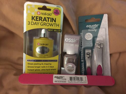 I decided to do something about it. Wal-mart shopping it was. Last night, I went and bought the basic necessities for doing my own nails. I bought a file, nail trimmers, one bottle of clear polish and one bottle of color. Now, I will admit I bought a good brand, in hopes it won’t chip as quickly.