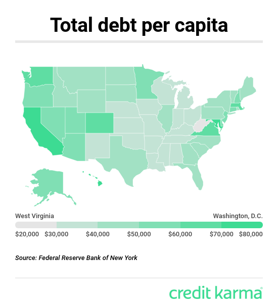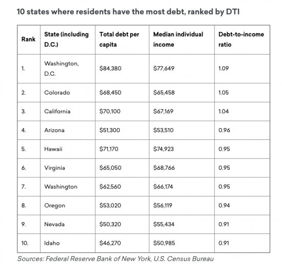 Debt ranges wildly from region to region. And surprisingly, to me at least, the wealthier states have higher debt to income ratios!